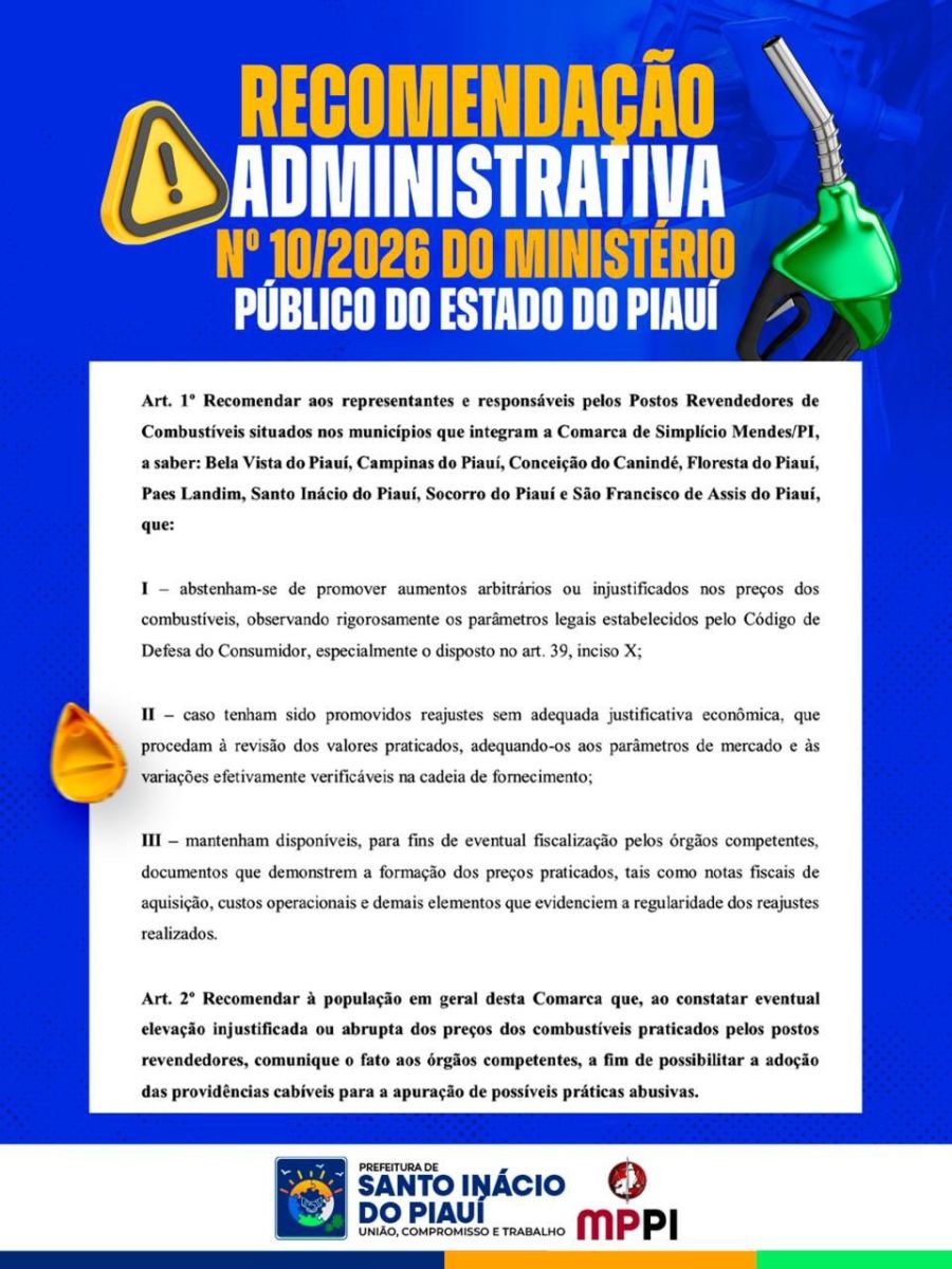 O Ministério Público do Estado do Piauí solicitou ao município de Santo Inácio do Piauí que promovesse a divulgação da Recomendação Administrativa Nº 10/2026 em nossos canais oficiais de comunicação.